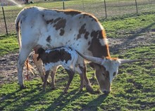 Stop Box is special. He is a carrot loving, gentle, giant! His Dam, Rusty Tool, comes from big bodied, twisty horned genetics and his sire, the great Drop Box, needs no introduction. A DCC bred mountain, Stop Box is what many consider to be, the most complete son of Drop Box. His dam has reported in with 81" TTT and his sire has topped the 90" TTT plateau. Stop Box's three-generation pedigree shows nine individuals with horns over 80", two of which have topped 90", and yet another two over 100". This guy has size, conformation, horn growth, bone density, and on top of everything else, is gentle as a lamb. He has won his class in every futurity in which he has participated and has only placed as second overall bull to the senior bull winner. Stop Box 2020 is the complete package and is putting quality calves on the ground!