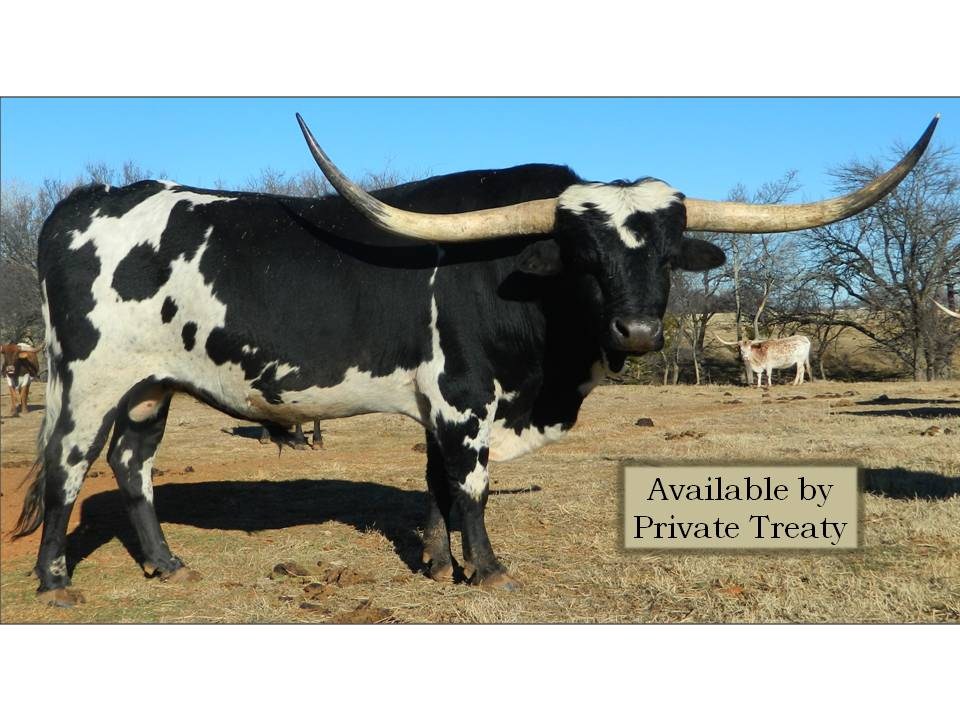 A 2015 Longhorn World Champion! This bull is a complete package. He is passing his color down to his calves along with thick horn bases and a lower, more lateral horn set! Top Caliber son, very genetically related to the famous Saddle Horn.